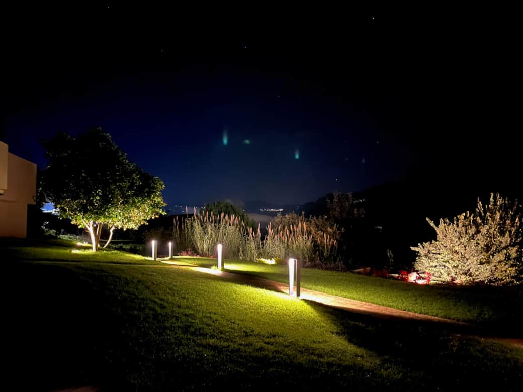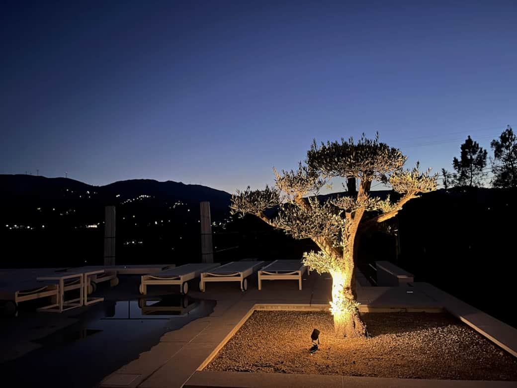 Bei Einbruch der Dämmerung entfaltet sich ein faszinierendes Spiel aus Licht und Schatten: Bodenspots tauchen Bäume und Sträucher in warmes Licht, während lange Schatten über Terrassen und Pools tanzen. Die Silhouetten der Hügel und des Douro-Tals verschmelzen mit dem Sternenhimmel.