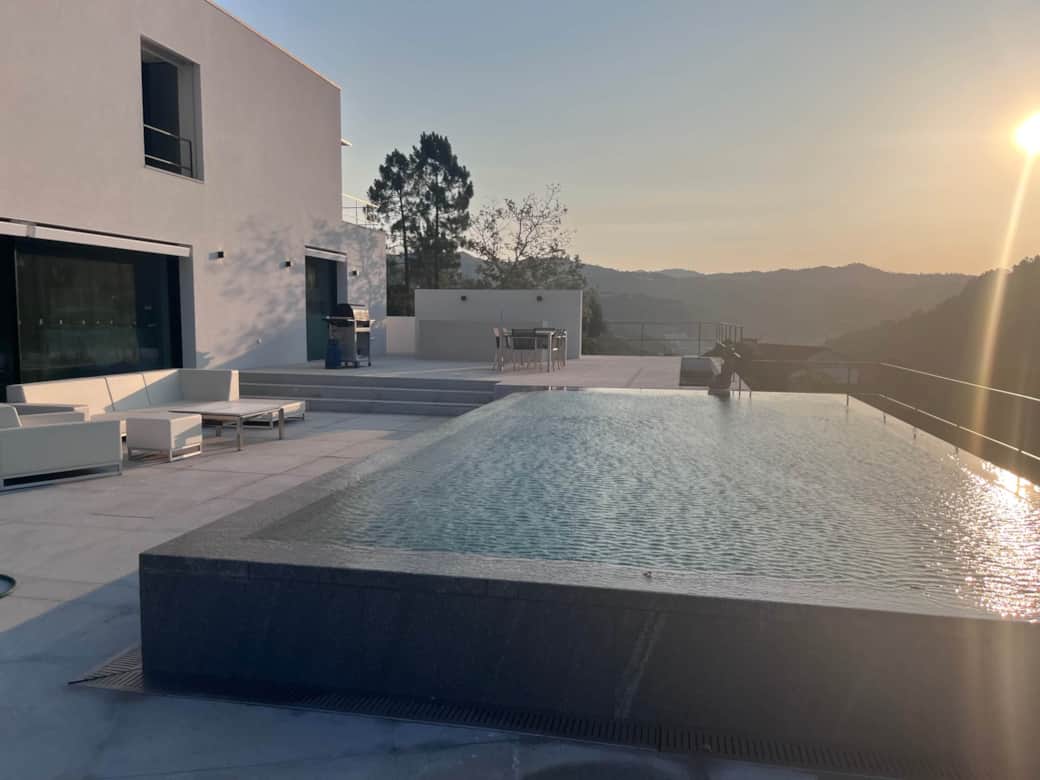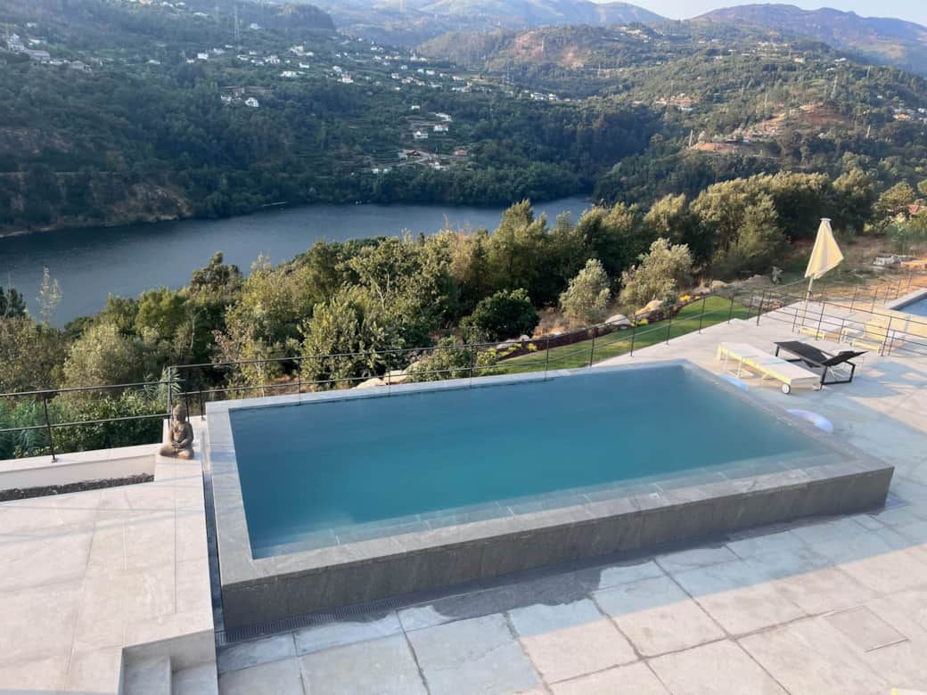 Genießen Sie den Infinity-Pool von Casa Calmavista – türkisfarbenes Wasser verschmilzt scheinbar mit dem Douro-Tal. Moderne Liegen und Sonnenschirme laden zum Entspannen ein, während der Blick über Landschaft und den glitzernden Fluss schweift. Das chlorfreie Salzwasser der Pools ist besonders hautfreundlich.